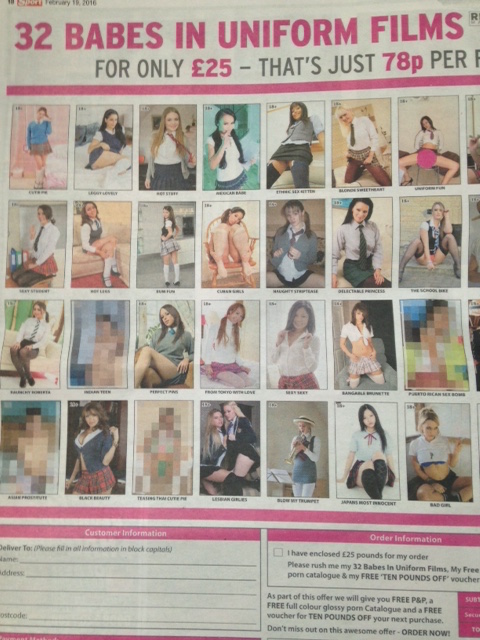 This month, campaigning organisation Not Buying It and the ASA will meet to discuss an end to porn and sex ads in the press, most notably in The Sport, which is almost all page 3 style pictures of women. In a recent issue of The Sport, one entire page is devoted to advertising 32 porn films of ‘babes in uniform’. School uniform.